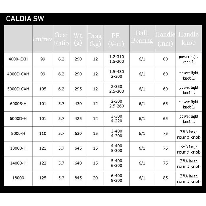 Daiwa Caldia SW ialah spinning reel yang direka khas untuk pancingan laut dengan fokus kepada kekuatan, ketahanan dan prestasi yang lancar. Dilengkapi teknologi seperti Monocoque Body dan Tough Digigear, reel ini mampu memberikan kuasa kayuhan yang tinggi serta tahan tekanan ketika melawan ikan laut yang kuat. Sesuai untuk casting laut, jigging dan offshore fishing.