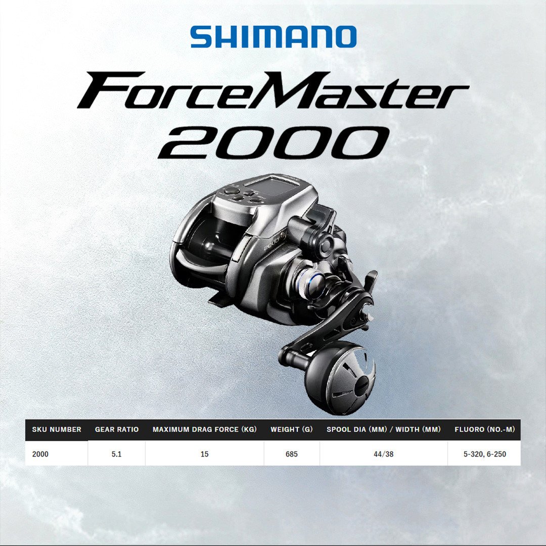 Shimano Forcemaster 2000 – ialah electric reel generasi terbaru yang direka untuk pancingan laut dalam berat dengan kuasa dan ketahanan lebih tinggi. Saiz 2000 menawarkan kapasiti tali besar serta motor yang lebih kuat untuk mengendalikan kedalaman tinggi dan ikan dasar bersaiz besar.