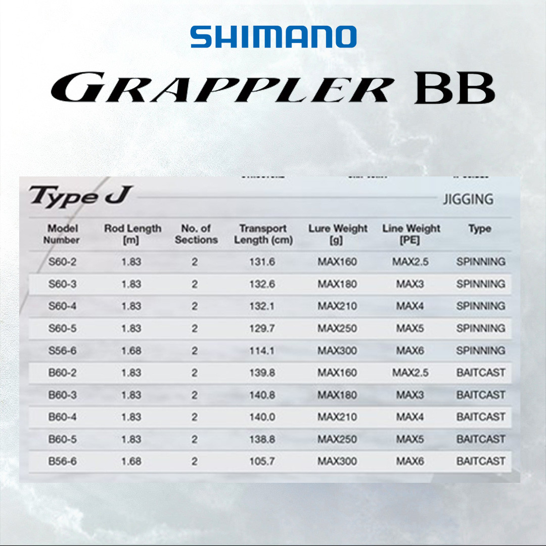 Shimano Grappler BB Type J ialah joran yang direka khas untuk vertical jigging dan speed jigging di kawasan offshore. Blank karbon yang kuat dengan aksi responsif membantu menghasilkan pergerakan jig yang lebih agresif serta memberikan kuasa yang mencukupi untuk melawan ikan pelagik di laut dalam. Rod ini sangat sesuai untuk offshore jigging, speed jigging, boat jigging dan deep sea jigging, memburu spesies seperti tenggiri, amberjack, GT dan tuna.