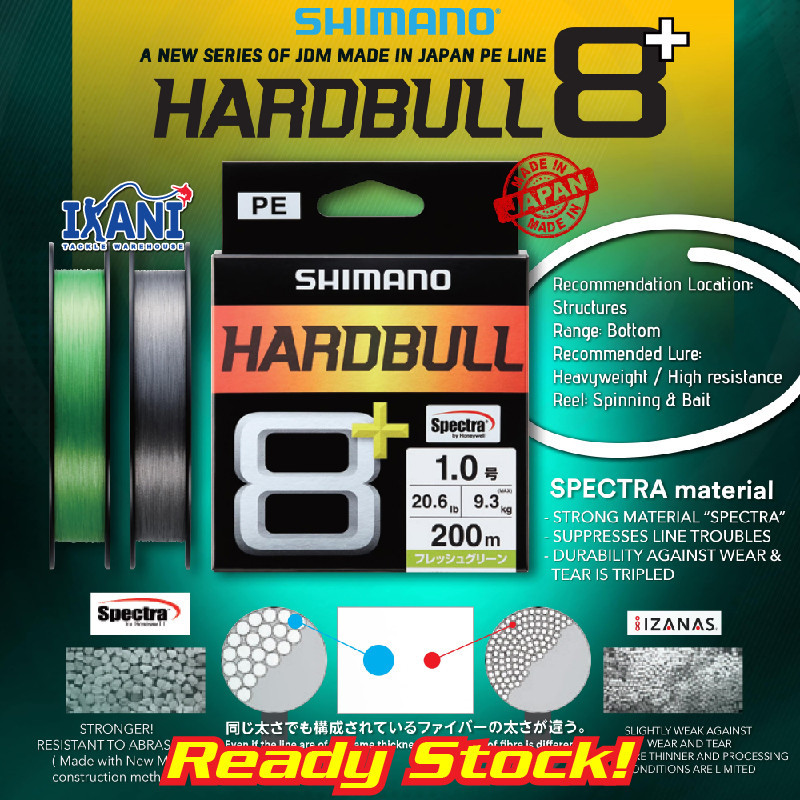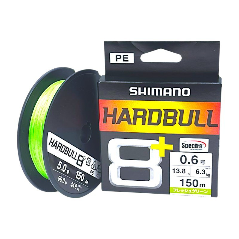 Shimano Hardbull 8+ ialah tali braided premium yang direka untuk pemancing yang memerlukan kekuatan tinggi, ketahanan geseran dan prestasi stabil untuk pancingan laut. Menggunakan Spectra fiber material, tali ini memberikan ketahanan yang lebih tinggi terhadap geseran serta mengurangkan masalah line trouble ketika memancing di kawasan struktur atau dasar.