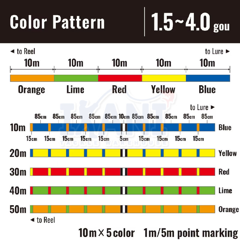 Multi Color – warna berubah setiap 10 meter untuk memudahkan pemancing mengetahui kedalaman jig ketika jigging.