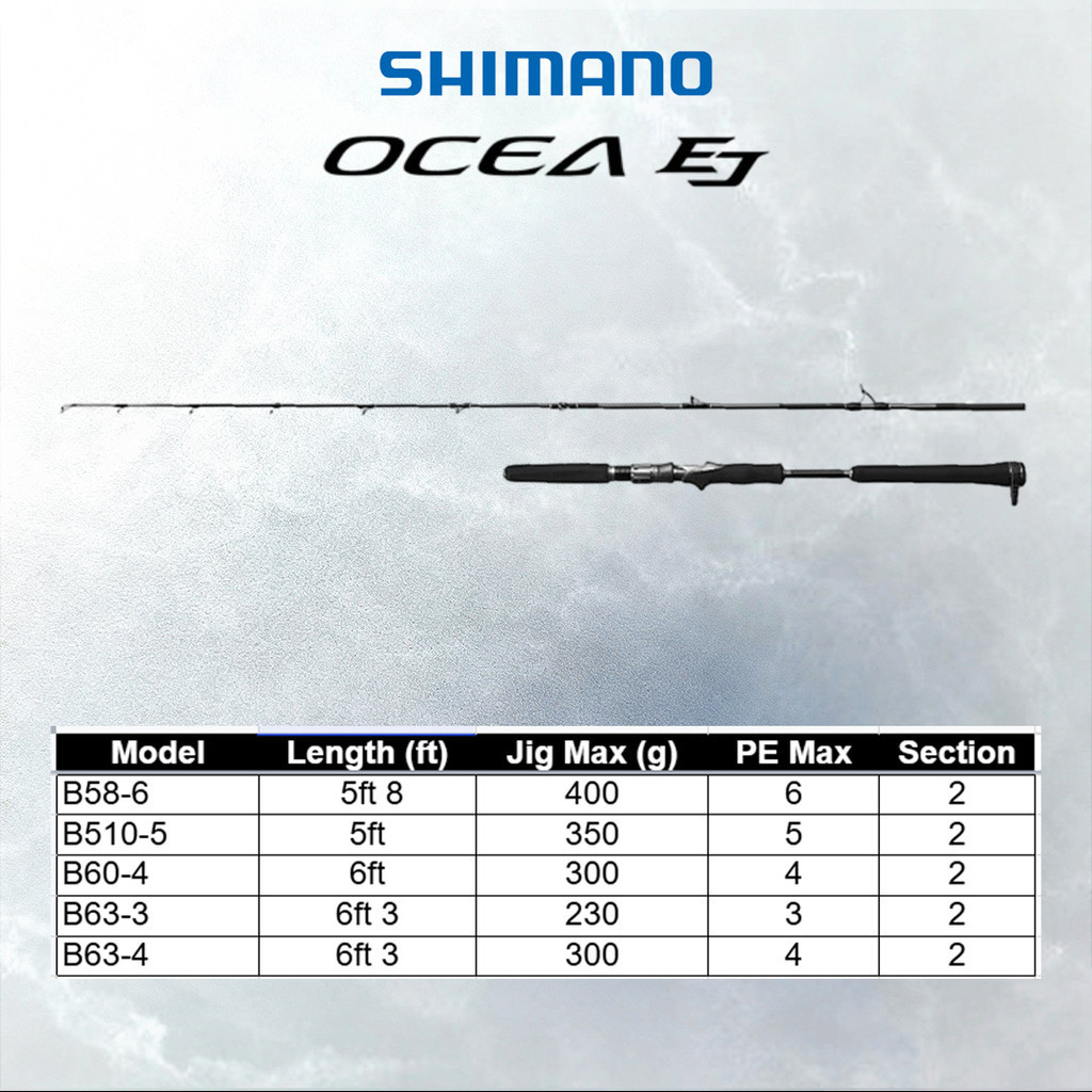 Shimano Ocea EJ ialah joran khas yang direka untuk teknik electric jigging (EJ) menggunakan electric reel seperti Beastmaster atau Forcemaster. Rod ini mempunyai blank karbon yang kuat serta aksi yang responsif untuk membantu menggerakkan jig dengan lebih stabil walaupun menggunakan bantuan motor reel. Dengan kuasa backbone yang tinggi serta lenturan yang seimbang, Ocea EJ sangat sesuai untuk electric jigging, slow jigging, offshore jigging dan boat game fishing bagi memburu spesies laut dalam seperti amberjack, tenggiri, tuna dan kerapu.