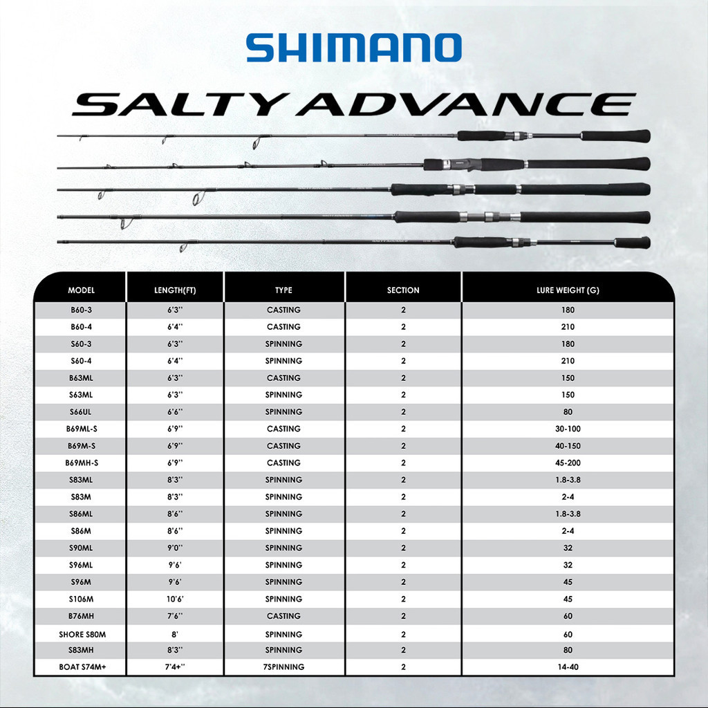 Shimano Salty Advance 2025 ialah siri joran laut yang direka untuk memberikan prestasi tinggi dengan harga mampu milik. Dibina menggunakan carbon blank yang ringan tetapi kuat, joran ini memberikan sensitiviti yang baik untuk mengesan getuan ikan serta kekuatan yang cukup untuk melawan spesies laut. Salty Advance sangat sesuai untuk pemancing yang mahu joran serba boleh untuk casting, shore fishing, light jigging dan boat fishing.