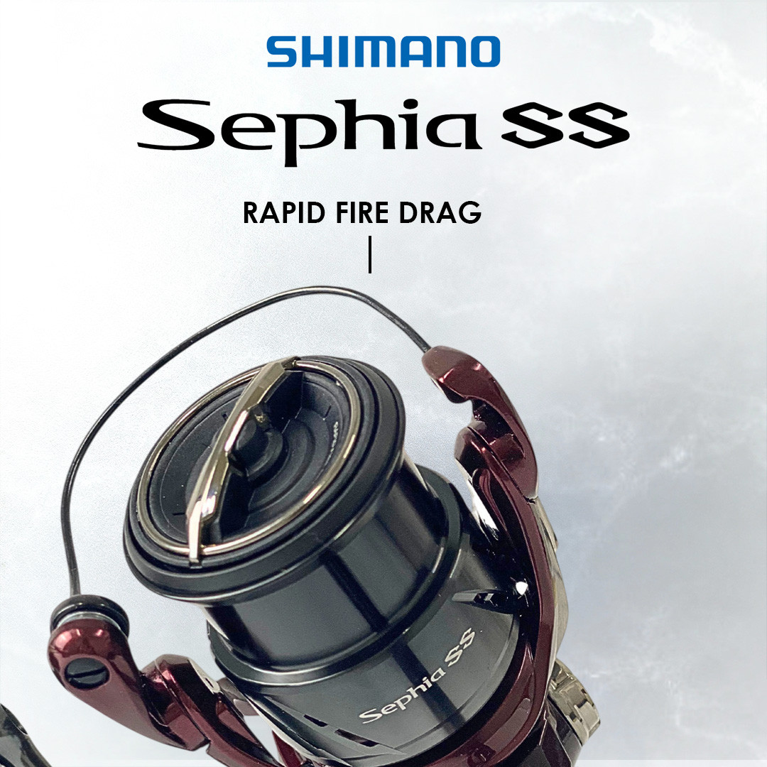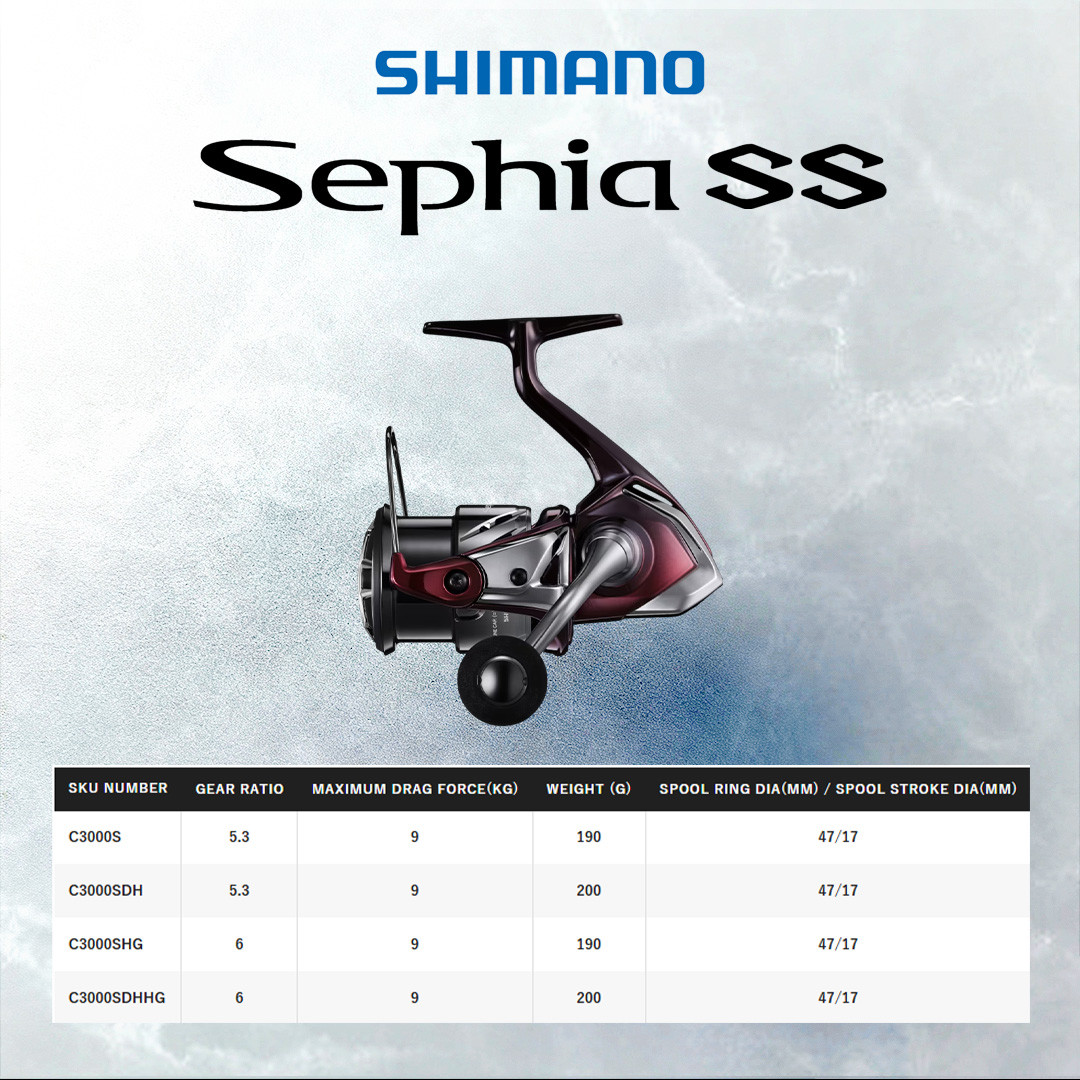 Shimano Sephia SS – ialah spinning reel khas untuk teknik eging (pancing sotong). Direka ringan, sensitif dan sangat responsif supaya setiap getuan sotong dapat dirasai dengan jelas. Reka bentuknya yang elegan dan seimbang menjadikannya pilihan ideal untuk sesi eging siang atau malam.