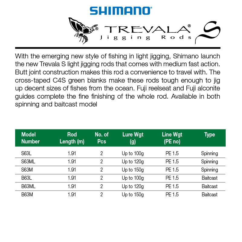 Shimano Trevala S merupakan joran jigging yang direka khas untuk pemancing laut yang mahukan kuasa, ketahanan dan sensitiviti dalam satu joran. Dibina menggunakan High Modulus Carbon Blank, joran ini mampu memberikan aksi yang responsif ketika menggerakkan jig serta kekuatan yang cukup untuk menahan asakan ikan laut. Reka bentuknya yang ringan membantu pemancing melakukan light jigging dan slow jigging dengan lebih selesa walaupun dalam tempoh memancing yang lama.